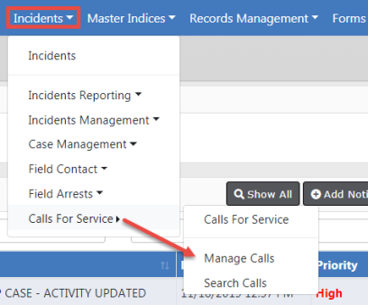The Calls For Service module is located on the top Navigation Bar under the Incidents menu option. Click on the Calls For Service menu option to display a sub-menu that allows you create, edit, view, and search calls.