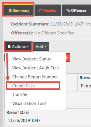 1. On the initial unapproved Incident report, click the Action button from the Summary tab, then select Create Case from the drop-down menu.