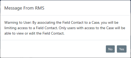 | 5. | A warning message appears informing you that by associating the Field Contact to the Case, limited access to the Field Contact occurs. Only users with access to the Case are able to view or edit the Field Contact. Click No to return to the Case without associating the Field Contact, or click Yes to associate the Field Contact to the Case. |
