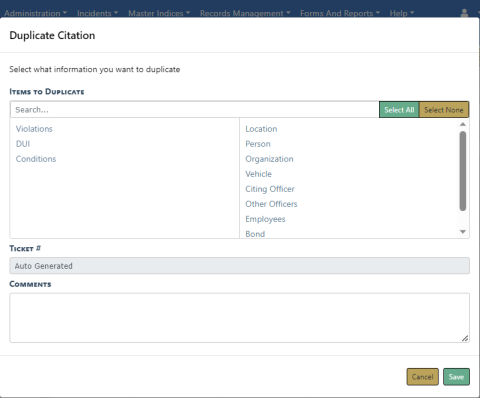 In cases where two or more people are being cited for the same charge(s), it may be more efficient to create one ticket, duplicate it, and then edit the duplicate for another person. The process can be repeated as many times as needed.