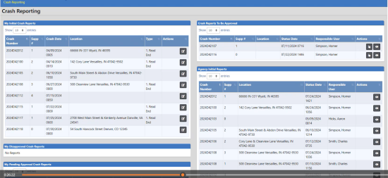 From the Crash Reporting landing page, users may search existing crash reports, see initial crash reports and reports pending approval, and view approved/disapproved crash reports.