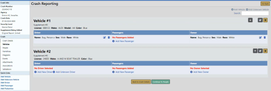 If there are no vehicles available from which to select, add vehicles as required. Vehicle 1 is typically the vehicle that caused the crash, but your agency may ahve specific or different requirements.