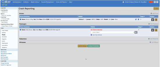 When entering information, you may enter drive and passenger information directly within the report. RMS Online will access the People Search as required when filling out these fields.