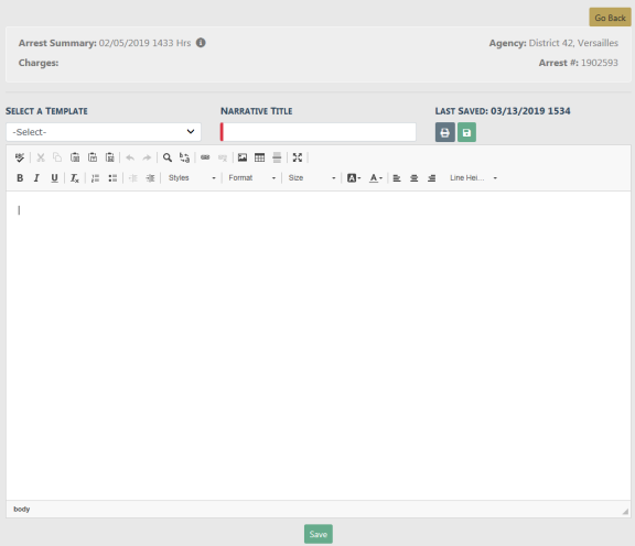 1.    Click the Add Narrative link to open the Add Narrative screen. You must enter a Title and additional information in the body of the narrative.