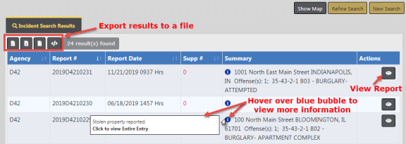 At the top of the Incident Search Results window there is a Show Map feature that plots the listed reports with GEO Verified addresses using Google Maps. The Export Results allow you to export the list to a PDF document which can be printed, export to an Excel document, export to a Comma Spaced Values (CSV) file, or to an Extensible Markup Language (XML) file.