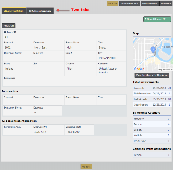 This displays two tabs, Address Details and Address Summary, that lists all involved incidents tied to this location, and details about the location itself.
