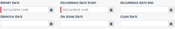 The Incident Report Times area contains the various times associated with the incident, Report Date, Occurrence Date, Dispatch Date, On Scene Date and Clear Date. These incident date(s) and time(s) may be completed in Incident Reports generated by Caliber CAD or by the Calls For Service module but they still need to be verified by the user for completeness and accuracy. Editing is permitted as needed.