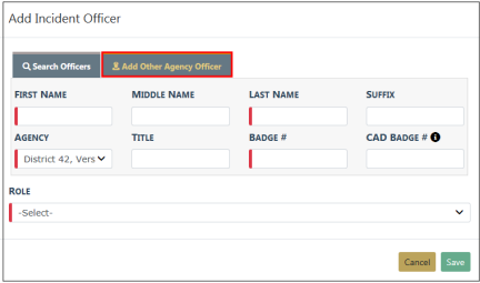 Select Add Other Agency Officer to add officers from other agencies. These are officers who are not Online RMS users within the current schema.