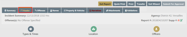 The Header Tab contains 3 separate sections: Report Types & Times, Location, and Officer. By using the Wizard the sections are completed in the listed order, though the use of the Wizard is not required.