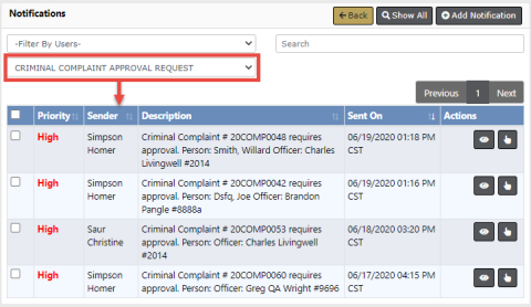 If you have permissions to approve Criminal Complaints, you receive Criminal Complaint Approval Request notifications when users submit Criminal Complaints for approval.