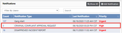 1.   Click on the Count in the first column of the notification to view all Criminal Complaint Approval Requests.