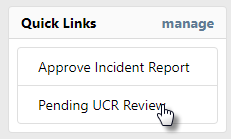 c. If available, click on the Pending UCR Review link in the Quick Links box. If the Pending UCR Review link doesn't appear, you can with appropriate permissions, add this link to the Quick Links box. This appears only on your Home Page, no one else's. For instructions, refer to the Quick Link section of Home Page - Prior to RMS 11.12.