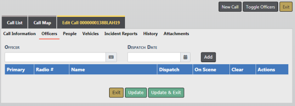 Use the Officers sub-tab to assign the call to specific Officers and enter the Date and Time the officers are Dispatched; from this screen you also have the ability to indicate an On-scene time and Clear time.