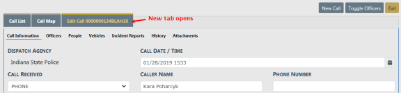 A Call Number is assigned to the Call For Service record automatically and a Edit Call tab opens.