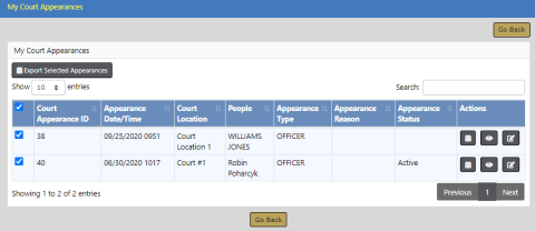 a. For multiple Court Appearances, check all that apply, then click Export Selected Appearances to download all selected schedules to one ics file.