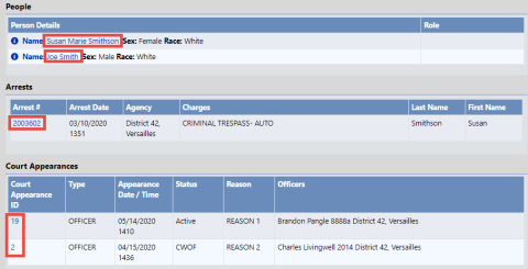 | 4. | Optionally, click on the person name, Arrest ID, Court Appearance ID, etc., to view details. |