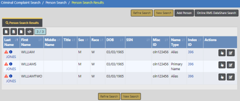 You have the option to click the Edit icon to update the master person record to correct or update person details before you select the record. You also have an opportunity to edit the person details from the Add Criminal Complaint screen on the next step.