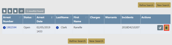 1. In the Search Results window locate the appropriate Field Arrest record then click on the Delete icon