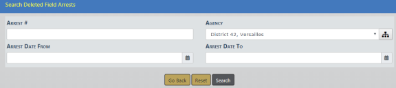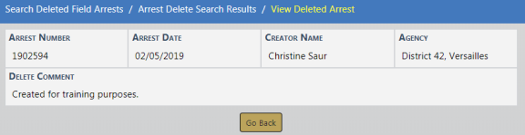 The deleted Field Arrest is logged automatically for tracking purposes. To view the log entry, select the Incidents menu, Field Arrests, then Arrest Delete Log.