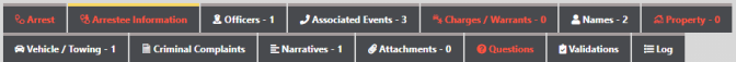 Individual tabs located in the center of the Edit Field Arrest screen organize the Field Arrest details.
