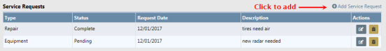 | 4. | Click on the Vehicle tab of the Edit Fleet Vehicle window, page down until you see the Service Requests grid, then click Add Service Request. |