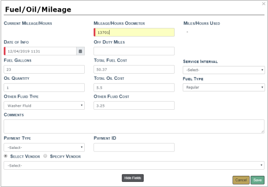 | 2. | Click Save to apply the changes, or click Cancel to return to the Fuel/Oil/Mileage Tab without saving. |