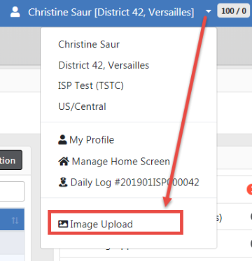 1.   Click on the down arrow next to your user name on the top right of the window, then click Image Upload.