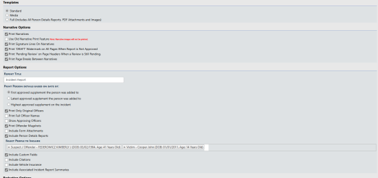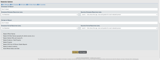 | • | Media- selects the most common public information areas to include and appropriate redaction options. The checked areas can be edited to further customize your print. Please refer to your agency’s policy on Public Information. |