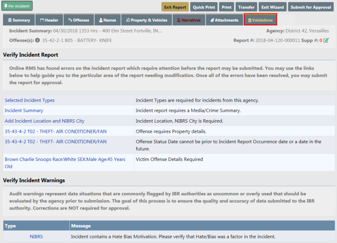 The Validations Tab allows a final check of your report to ensure the minimum requirements are met based on the offense(s) entered on the report. The validation check occurs automatically when navigating to the Validations tab. The validation process verifies all the minimum requirements are met, then lists information still required for the report along with a hyperlink to that section of the report