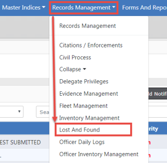 | • | Click the Records Management Menu then click the Lost and Found submenu option. |