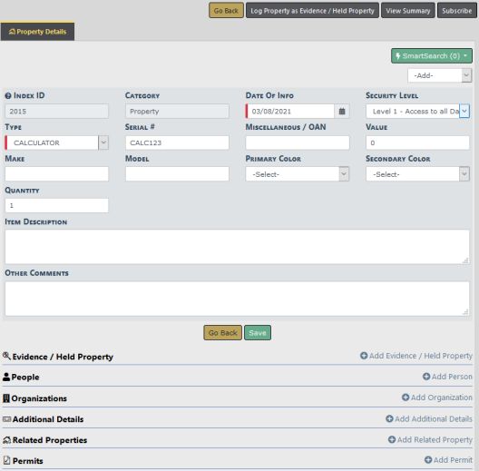 Note: To have access to the Evidence drop-down option and the Log Property Evidence/Held Property button, you must have the Master Indices - Add Evidence to Master Index Property permission.