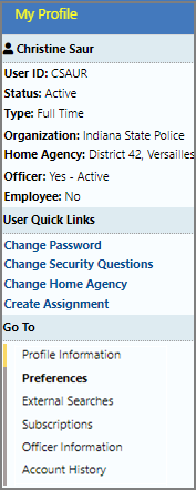 My Profile is a page that contains an organized set of links to various settings and functions specific to each user, such as user profile information, preferences, subscriptions, officer information, change password and security questions links, and more.