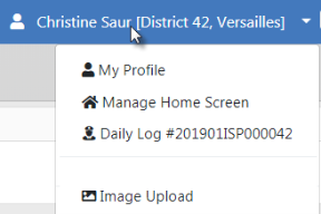 Click on your user name to display menu options. The drop-down contains My Profile, Manage Home Screen, Current Daily Log (or the option to create a new log if one does not already exist), and Image Upload.