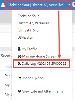 As an officer, you can access your existing current log from the Home Page by clicking on your user name in the upper right corner, then click Daily Log (notice the current log number also displays).