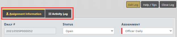 The Daily Log summarizes the officer's activities during their shift, such as assignments, issued equipment, report assignments and filings, and other activities. The officer can enter data as needed, and specific actions, such as creating incident reports, are automatically captured in the log by the system.