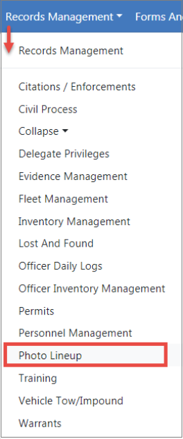 | 1. | Select Photo Lineup from the Records Management Menu. |