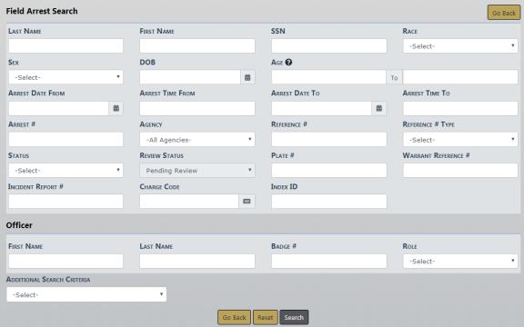 Search for the Field Arrest record by entering the information you know about the arrest, then click the Search button to display a list of Arrests from which to choose.