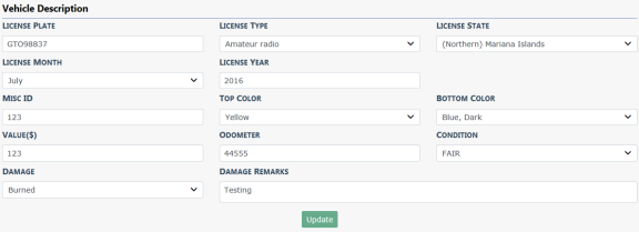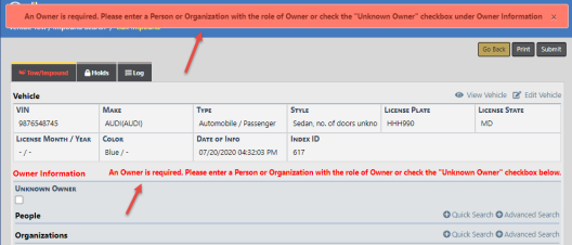 Owner information is required to update a Tow Impound record. If the record does not contain owner information, a message appears in red across the top of the form and below the Vehicle section when you click on the Update button. If the owner is unknown, check the Unknown Owner box to override the owner required warning.