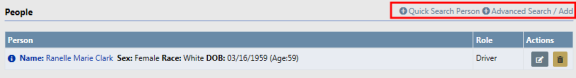 The People section allows you to search the Master Name Index and use existing records if already in system by clicking on the Quick Search Person link, or you can, with proper permissions, add a new Master Name Index record by clicking on the Advanced Search / Add link. For more information on Master Indices, refer to Master Indices.