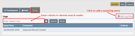The Log tab of the Edit Impound page displays impound activity that was systematically logged for that particular vehicle, including manual log entries you create. For details on accessing the Edit Impound page, refer to Update Existing.