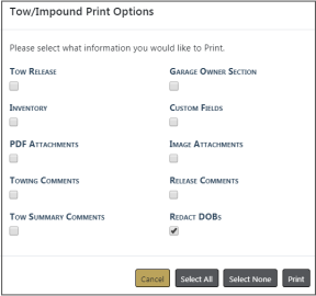 The Tow/Impound Print Options window opens. Select the options you want to include in the report; green options are included and gray options are not.