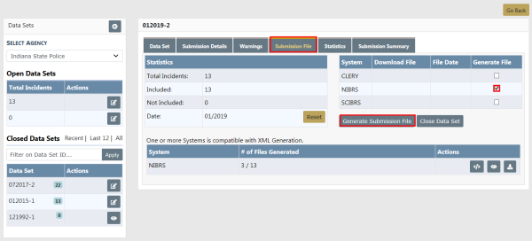 1. To generate the submission file you must first check the appropriate checkboxes in the Generate File column, then click the Generate Submission File button.