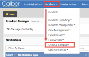 To access the Criminal Complaint standalone module, select the Criminal Complaint option from the Incidents drop-down menu.