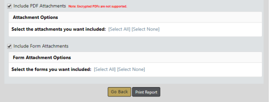 7. Select the Form Attachments you want to include or exclude, if applicable, by clicking Select All to include all existing form attachments on the report, or click Select None to exclude all.