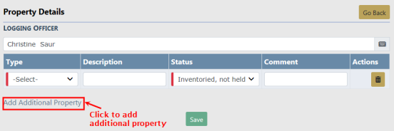 Note: The Arrestee Property Not Inventoried box must be unchecked for the Add Personal Property link to appear.