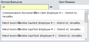 on the right supply a list of available values based on data you type in the field. For example, click into the Officer/Employee field and type a portion of the name to view a list that matches your entered text, then click on an option from the list to populate the Officer/Employee field.