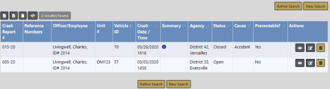 Click Refine Search to modify your current search criteria, click New Search to start the search over. Click on the Crash Report Number of the crash record to view details, or click on the View icon