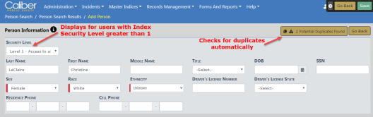 Enter the person information. Online RMS checks for duplicates automatically, and it displays a message indicating whether or not duplicates exist. For more information about duplicate records, refer to Duplicate Records.