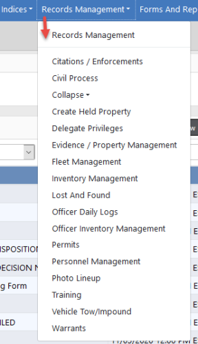 The Records Management button is located on the navigation bar at the top of the Online RMS window. The down arrow on the right of the button indicates additional menu options are available. Click on the Records Management button to display menu options.  The menu options vary by agency and permissions.
