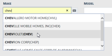 When searching by Make and Model, begin entering a portion of the word and a list will appear from which to choose. For example, enter Chev in the Make field to display a list that contains Chev then click on the appropriate item that appears on the list. Optionally, do the same for Model
